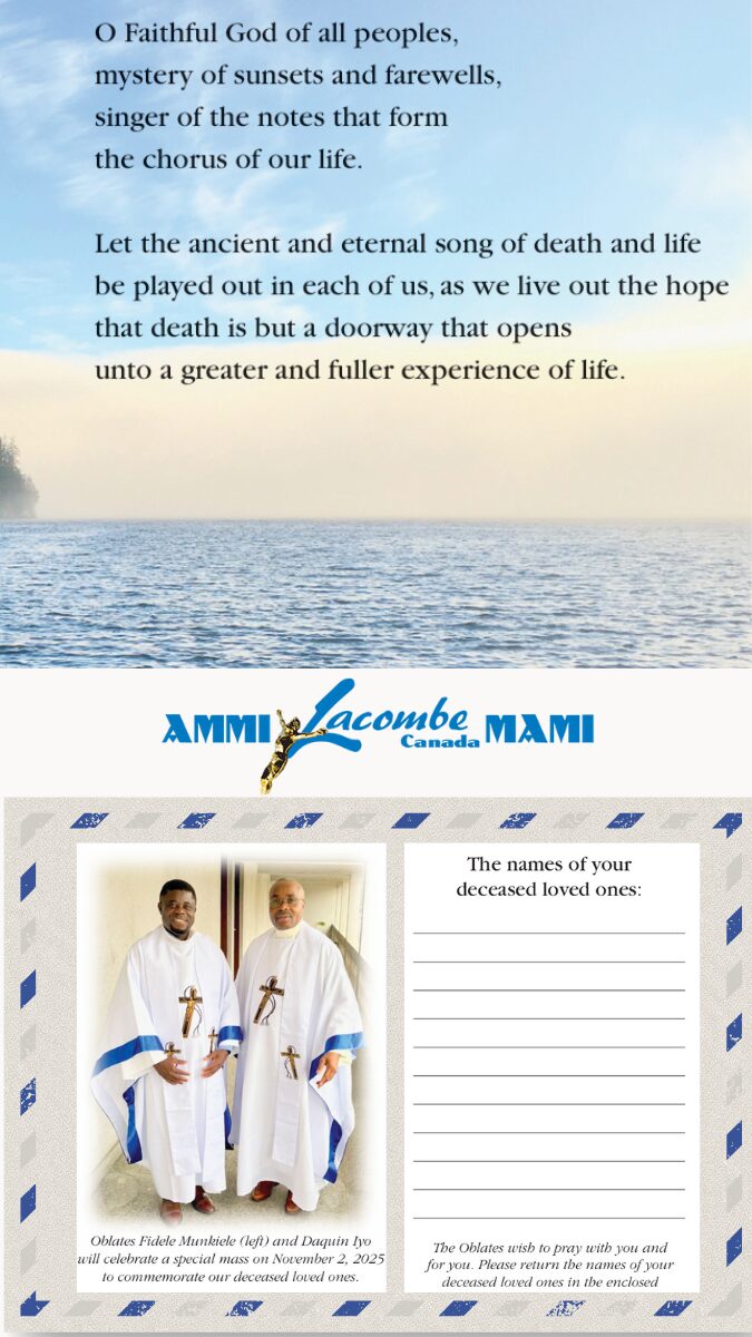 To honour this sacred day, Fathers Daquin Iyo, OMI, and Fidèle Munkiele, OMI, will celebrate a special Mass in Kenya, lifting in prayer the souls of all those we hold close in our hearts. As MAMI members, we are united with the Oblate family around the world in prayer, held together by a love that knows no boundaries.