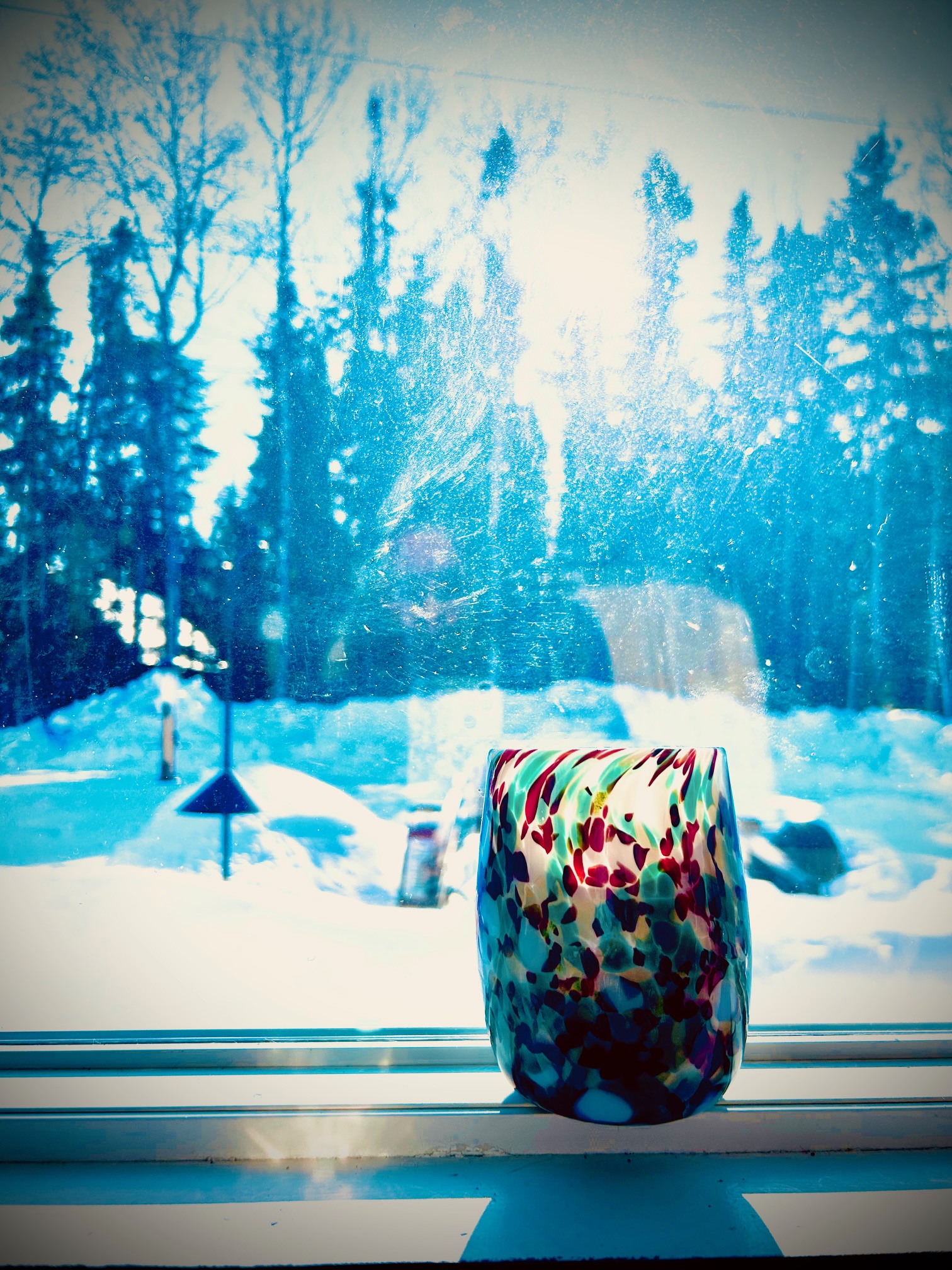I was drinking wine out of a hand-blown glass resplendent in greens and reds and whites – Christmas colours. I had put out seeds for my resident squirrel, who promptly ignored them in favour of trying to defeat the squirrel-baffle-protected bird feeder (which, incidentally, contained the exact same seed). A chickadee resolutely ignored the overflowing feeder altogether and instead went for the stale bread I had put out for the whiskey jacks – ordinarily opportunistic little thieves who, on this particular afternoon, were nowhere to be found. A woodpecker appeared just often enough to get my attention, but not long enough for me to determine what kind of woodpecker it actually was. Meanwhile, a nuthatch kept returning to the suet feeder, supremely unconcerned about all of this.