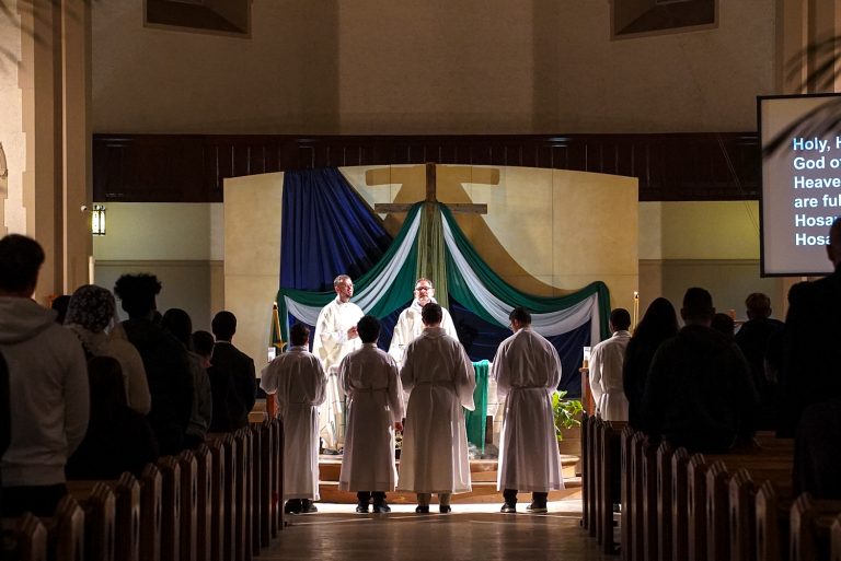 More than 160 Catholic young adults gathered on Sunday, November 23 at 7:00 pm to celebrate the Solemnity of Our Lord Jesus Christ, King of the Universe at St. Joseph’s Parish in downtown Ottawa — in a Neo-Gothic church consecrated in 1932. They were joined by 12 choristers and organist Jamie Loback, leading the congregation in a selection of hymns that complemented the grandeur of a feast that marks both the end of the Liturgical Year, as well as Christ’s dominion over all Creation. Fr. Robert Laroche, the Pastor of St. Joseph’s Parish and a member of the Missionary Oblates of Mary Immaculate, presided and offered the homily. Fr. Mark Augustine, a doctoral candidate in Canon Law at Saint Paul University, concelebrated.