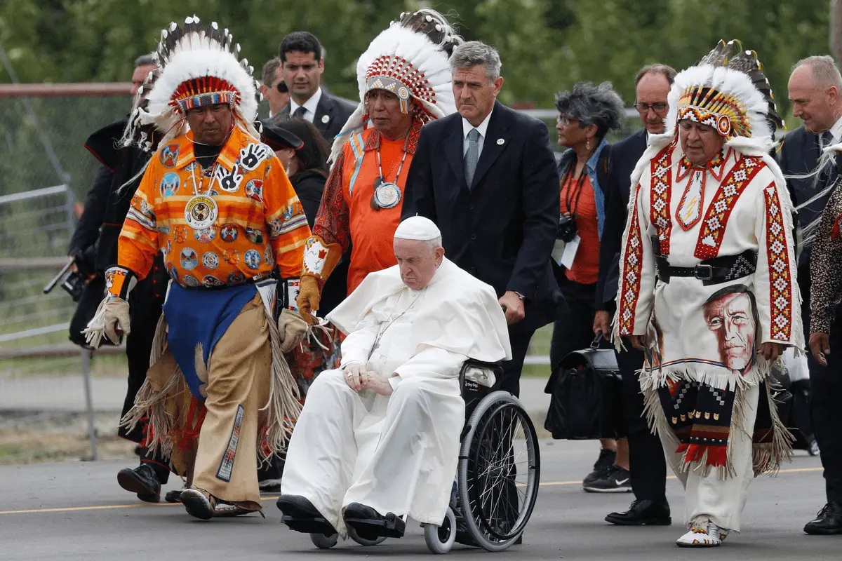 Pictured left: Pope Francis arrives with Indigenous leaders for a meeting with First Nations, Métis and Inuit communities at Maskwacis, Alberta, July 25, 2022.