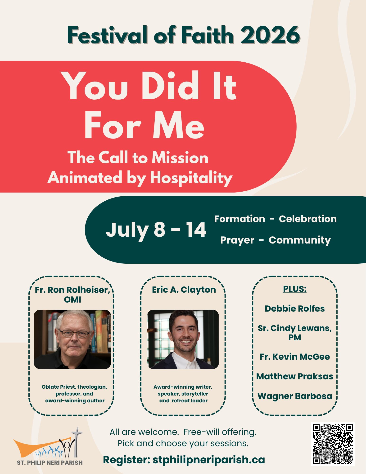 I am delighted to share information about the Summer Festival of Faith, taking place here in Saskatoon this July. Conceived by Fr. Doug Jeffrey, OMI, the inaugural Festival in 2025 was a testament that the Charism of St. Eugene is alive and well in Saskatchewan! We are incredibly thankful to Fr. Ron Roheiser, OMI, for continuing to share his gifts with us here in Saskatoon, as he had done for over **** years at Queen’s House of Retreats before its closure. St. Philip Neri Parish is honoured to continue this tradition.