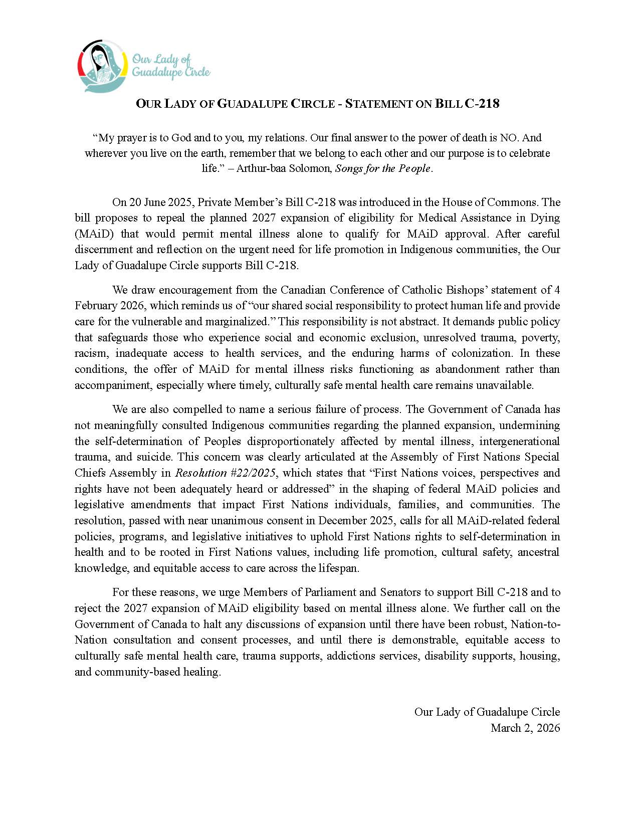 Our Lady of Guadalupe Circle – Statement on Bill C-218